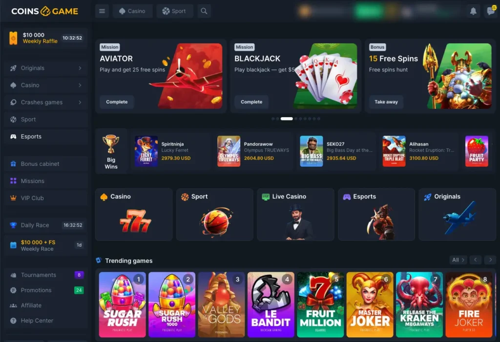 Coins.game casino lobby looks like this.